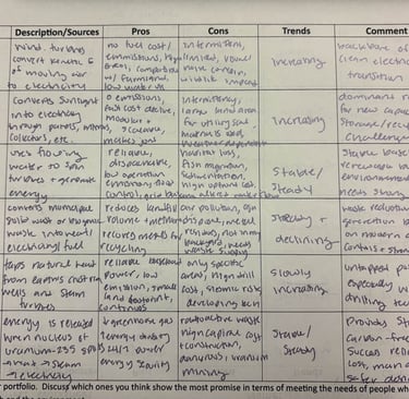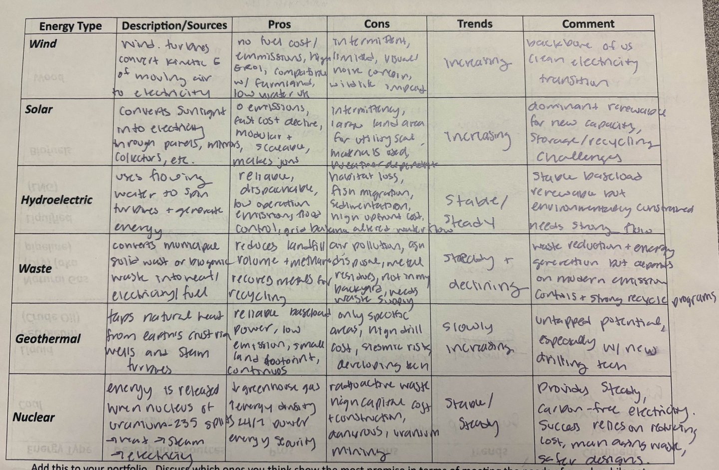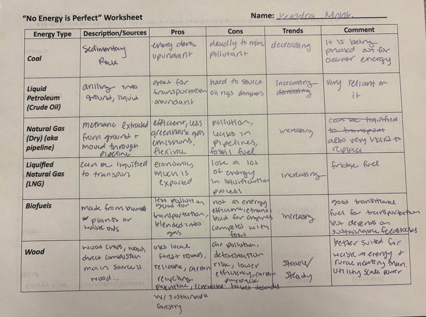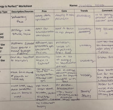 The above images show the "No Energy is Perfect" worksheet. This worksheet demonstrates that there is no one truly perfect energy source. Everything has their pros and cons and while some are more environmentally friendly, others are much more powerful and it is not feasible to choose just one energy source to power everything. Coal is extremely energy efficient and critical however it is deadly to mine and causes a lot of pollution when used. Liquid Petroleum and Wood has a similar issue. Natural Gas and Liquified Gas are more in between measures where they are a little greener but still powerful for the cost and very important for the economy. Wind, solar, and hydroelectric energies are all very environmentally friendly but are currently unstable as they depend on environmental conditions and are not a suitable source for all energy due to this. Waste does reduce landfills but it causes air pollution and more and is generally unpopular with people. Finally geothermal and nuclear are reliable and has low emissions but is only logical for very specific area and nuclear has dangerous radioactive waste. All of them have pros and cons and there needs to be a balance of using each of them to limit each type of pollution until a reliable zero-emission energy can be created, which I do believe is possible with the rapid advancements in that technology.