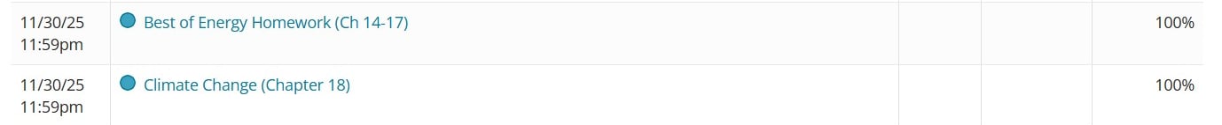 The above images show my results on the homework assignments and quiz for this chapter. Here you can see I got 100% on both showing my knowledge in the material covered in this chapter, specifically with the carbon cycle, biogeochemical cycles, and the input of nitrogen to Earth's ecosystem. I did work through the quiz three times to practice and ensure full understanding of the content.