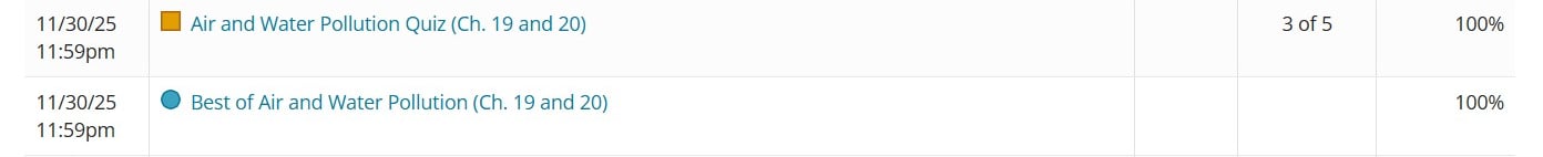 The above images show my results on the homework assignments and quiz for this chapter. Here you can see I got 100% on both showing my knowledge in the material covered in this chapter, with air and water pollution and their sources, pollution, and policies. I did work through the quiz three times to practice and ensure full understanding of the content.