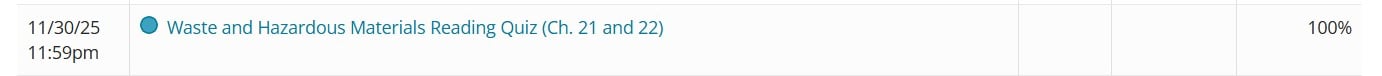 The above images show my results on the homework assignment for this chapter. Here you can see I got 100% on both showing my knowledge in the material covered in this chapter, with waste and hazardous waste specifically with source reduction, waste management, the lifecycle of waste, and different policies and pollutants.