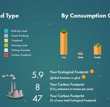 The breakdown below shows the breakdown of my footprint by land type and by consumption category. Here we can see that most of my footprint comes from carbon and cropland. The carbon footprint is likely high due to the animal products I eat, the fact that I do drive more than the average person for work and school, and the electricity and resources used at home. My other large land category is cropland which would directly relate to the fact that I do not grow all of my own food and do heavily rely on agriculture as a source of food. This is also reflected in my consumption categories as the highest one is food. Mobility, goods, ad services are categories of my footprint that would contribute to the carbon footprint. The structure of our society makes it hard for people to achieve true sustainability currently but hopefully we can make changes and achieve a sustainable earth before it is too late.