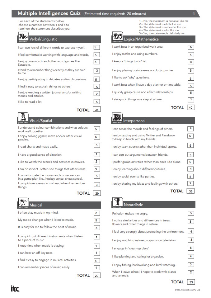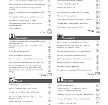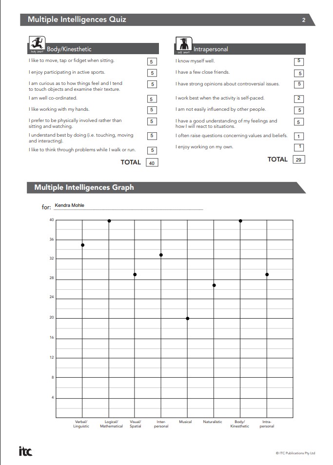 My weakest form of intelligence is musical intelligence. This I did anticipate as I have never really done anything with music and while I can often sing along to songs on the radio, I have no knowledge of notes or how to read or play music in any way. As I have not really ever developed this area of knowledge I was not expecting it to be very high.