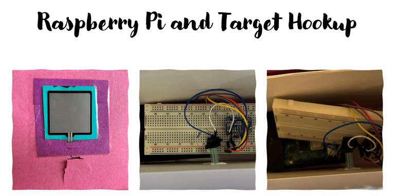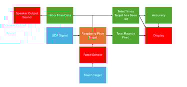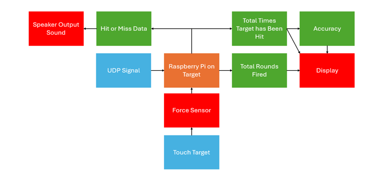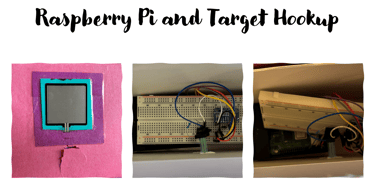 The target uses a force sensor to detect when it has been hit. The force sensor is hooked up to an ADC and the ADC output is read by the Raspberry Pi via I2C. In the code, a pressure threshold was set and used to track how many times the target was hit at different thresholds. This threshold was initially tested at 1000, 2000, and 3000 with a different output for when the different thresholds were hit. In the final code, the pressure threshold was set to 1000 so there would be no issues detecting a hit from the gun but not sending a signal if moved. This is the only electrical or mechanical not on the gun with the exception of the bluetooth speaker the target Raspberry Pi sends sounds to.
