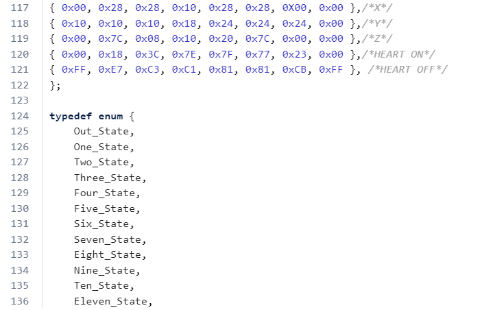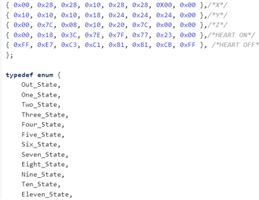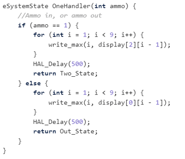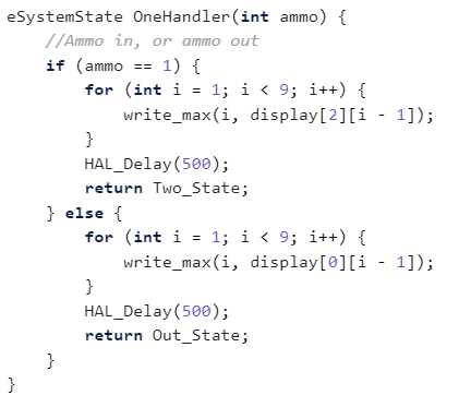 This code controls the LED Matrix displaying the ammo count of the gun. It employs a finite state machine for each possible number of balls in the chamber. If there is no ammo left in the gun, the matrix will flash a zero, otherwise the numbers stay constant and do not flash. If the IR Sensor sends a signal that a ball has been inputted, the state will switch to the one with one higher value and display the associated number. If the STM receives a signal hardwired from the Raspberry Pi on the Gun that a shot has been fired, the current state will go to one with one lower value and display that value. A maximum of 12 balls fit in the chamber so that is the highest state. If a discrepancy between the displayed value and actual number of balls in the gun, the user can empty the gun and then press the reset button to set the ammo count back to zero and reload the balls.
