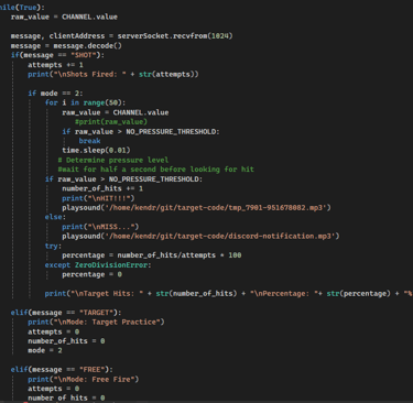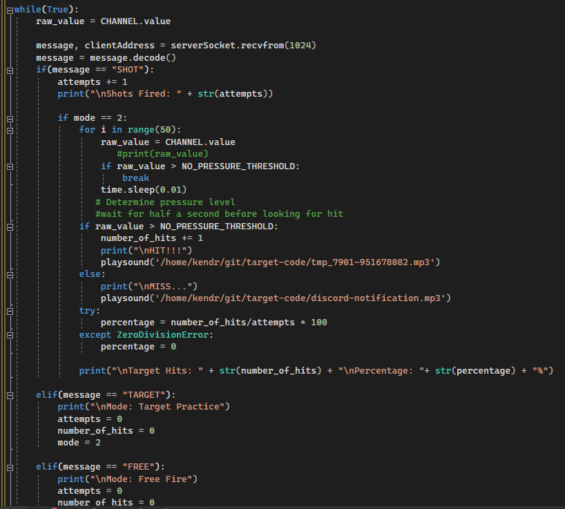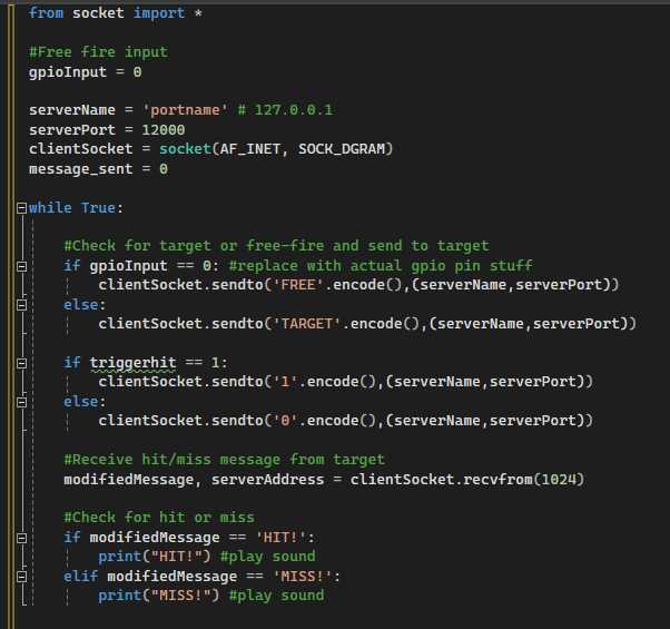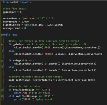 This code is the Client of the UDP and located on the gun. It tells the target which mode the user is in. It will send a message with the initial mode when turned on and will send an update each time the free-fire/target-fire switch is flipped. It will send a message of '1' if a shot was fired to let the target know each time that occurs. It then receives a message from the target stating whether the target was hit or missed and plays the associated sound. The trigger cannot be pulled if the RFID tag is not in contact with the Key and code not shown in the screenshot will not do anything if the gun is locked.