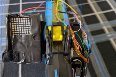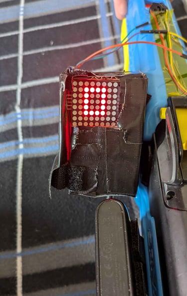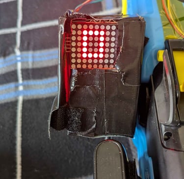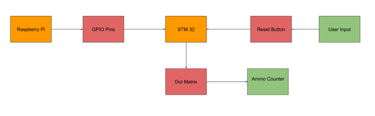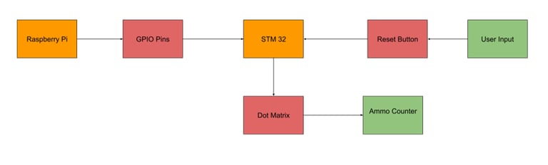 There is an LED Matrix display on the side of the gun that is controlled by an STM 32. The STM32 reads two inputs from the gun Pi that let it know when ammo has either left or entered the gun. The display shows the amount of ammo in the gun. It uses SPI to communicate with the STM board to display the custom-made numbers created. Additionally, the number zero on the LED Matrix will flash, catching the user’s attention when they run out of ammo. It is also important to note that, at the no ammo state, the STM32 communicates with the gun Pi to stop it from detecting “dry-fire” (no ammo left in the gun) shots.