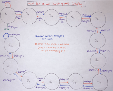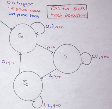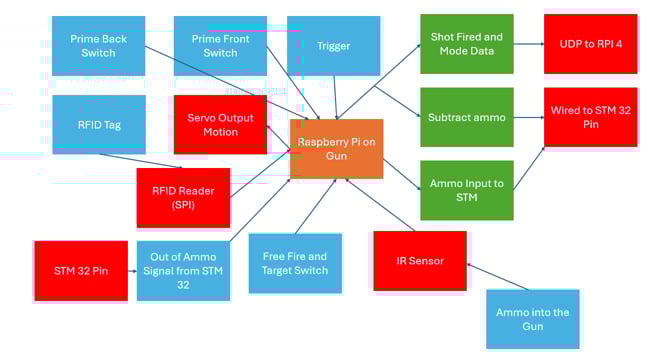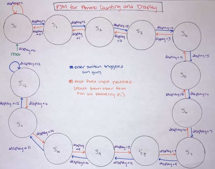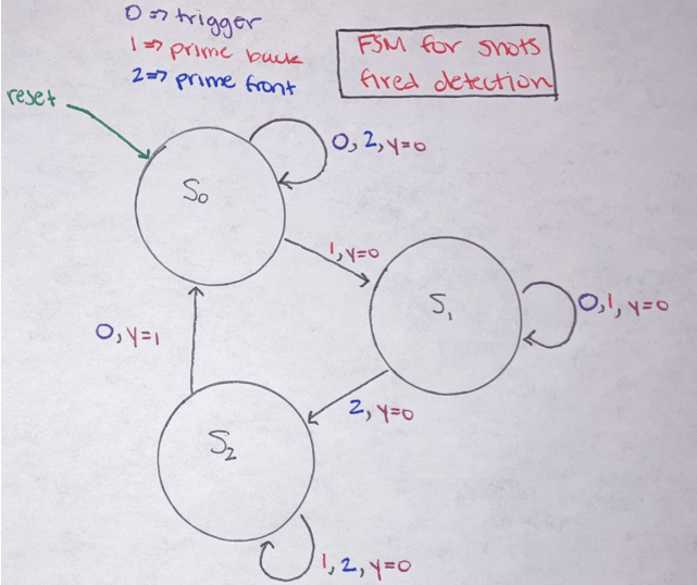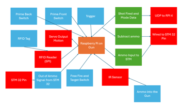 The type of Nerf gun we used has a three-step process to fire a shot. To fire the user needs to pull the slider back, push it all the way forward, and then pull the trigger. The trigger can be pulled at any time in this process and not do anything if the other requirements are not met first. Pulling the trigger without a shot being fired would cause issues with the ammo tracking on the STM 32 and also with the data tracking on the target Pi (total shots fired and the shooting accuracy). To avoid this issue, we created a state machine that would go through these three stages and only detect a shot fired after the gun had been locked, loaded, and then fired.