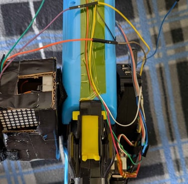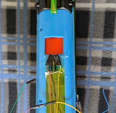 There is an IR transmitter and receiver on the gun itself to detect when ammo is put into the gun and when a shot is fired. The way ammo is loaded into the nerf gun and how the gun uses air pressure to fire did not allow for any internal switches or sensors for ammo tracking capabilities. One way to get around this issue was by adding an IR sensor. When a person loads a ball into the gun, the IR sensor will detect the light bouncing off the ball and send a signal to the STM 32 which handles the ammo tracking. This sensor is located on the gun slightly behind where the ammo is loaded in from on the top of the gun on the side closer to the user.