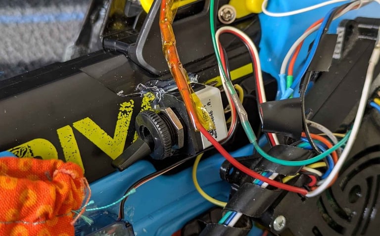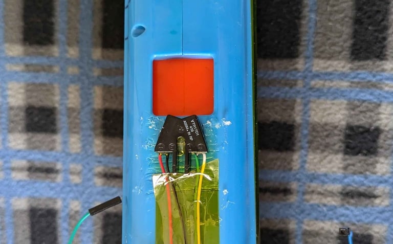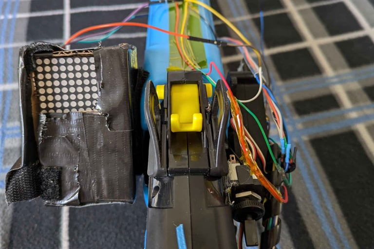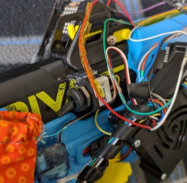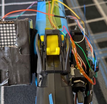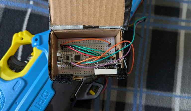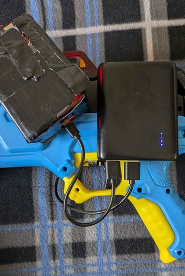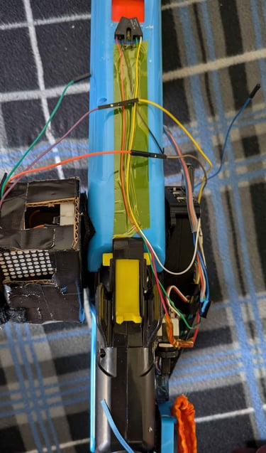 The Nerf gun comes with a target that contains a Raspberry Pi. That Raspberry Pi is connected via UDP to another Raspberry Pi located on the Nerf gun. The target Pi keeps track of total foam rounds fired, total times the target has been hit, and an accuracy percentage, while the gun is in “target fire” mode. Otherwise, the gun is in “free-fire” mode. In free-fire mode, the Raspberry Pi simply records foam rounds fired. A switch on the gun allows the user to change modes. The gun code will tell a Bluetooth speaker to make different sounds depending on whether the target has been hit or missed.