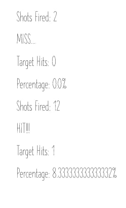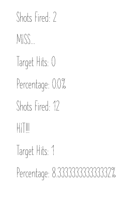 This code is the Server of the UDP and is run from within the target. All of the data the target is displaying is reset when the mode switch is flipped. If the target receives a message that a shot has been fired, it will add that to the total count of shots taken. While the target is in target mode, the target will display the number of shots, the number of hits, and the percentage of accuracy. It will also send a message back to the gun that there was either a hit or miss. If the program is in free fire mode, the target only outputs the number of shots taken.